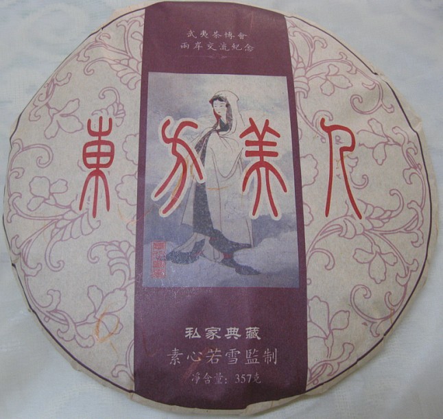 【茶类】乌龙茶【产地】台湾新竹县【商品描述】东方美人茶是台湾独有的名茶,又名膨风茶,又因其茶芽白毫显著,又名为白毫乌龙茶,是半发酵青茶中,发酵程度最重的茶品,一般的发酵度为60%,也些则多达75-85%,故不会产生任何生菁味,且不苦不涩。主要产地在台湾的新竹、苗栗一带,近年台北坪林、石碇一带亦是新兴产区。东方美人茶名字的由来,据闻是英国茶商将茶献给维多利亚女王,黄澄清透的色泽与醇厚甘甜的口感,令她赞不绝口,既然来自东方福尔摩沙,就赐名“东方美人茶”了。此款茶做成了饼茶,实属罕见,也很难得。